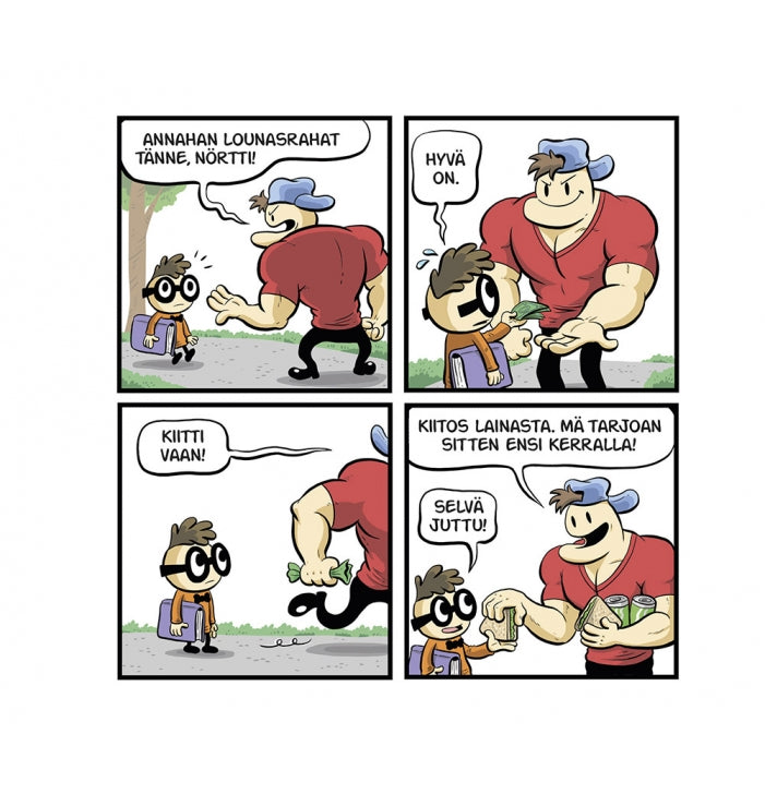 ”Nörtti ja Sportti” is feel-good comic about an unlikely duo: a little bookworm and a big-hearted gym muscle head. They are complete opposites, but at the same time best friends! On the pages of this book you can get to know the eventful adventures of the likeable pair from the very first meeting!