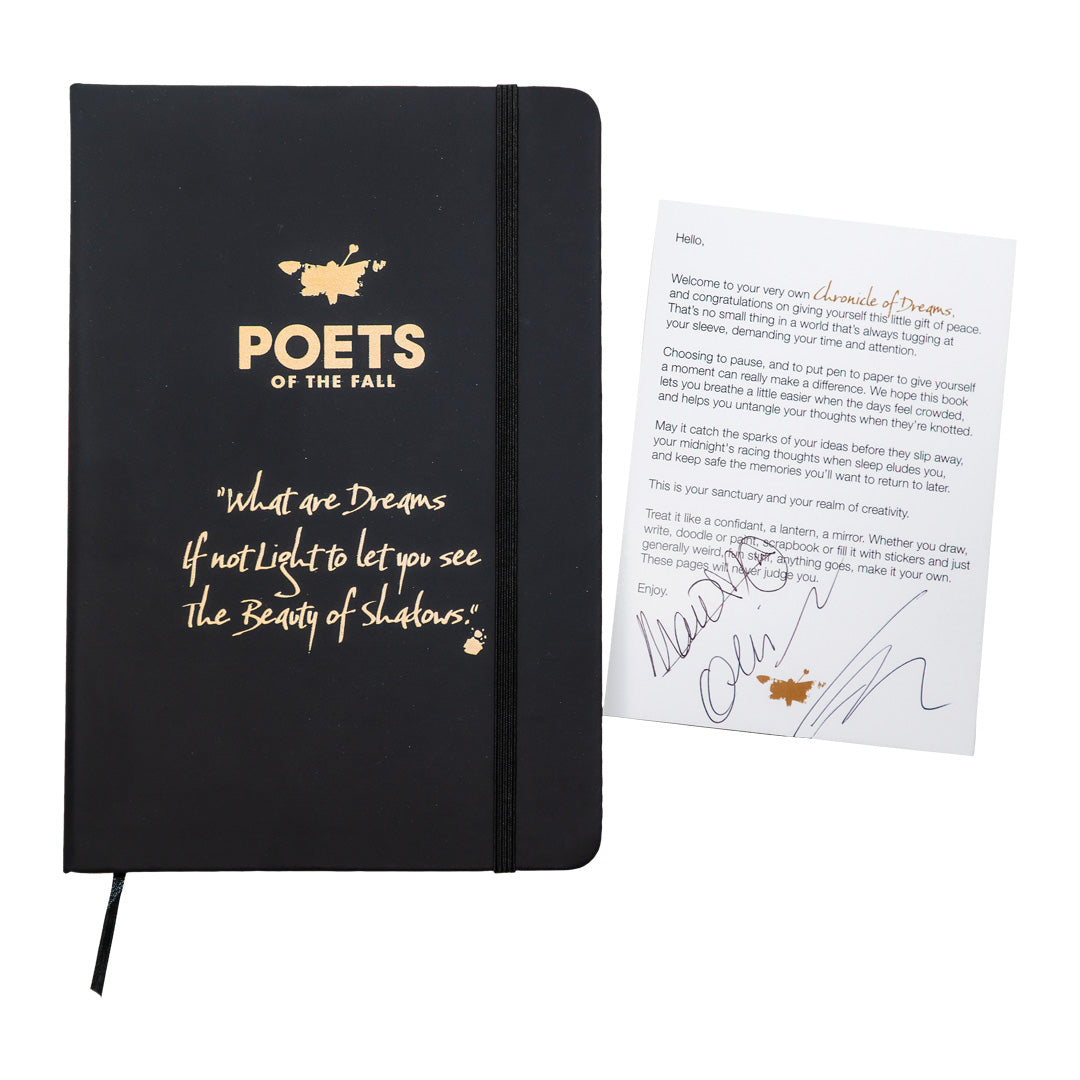 Nimmaroidulla kortilla varustettu "Chronicle Of Dreams" -muistikirja. Saatavilla yksinoikeudella virallisesta Poets of the Fall -kaupasta, tilaa omasi nyt!